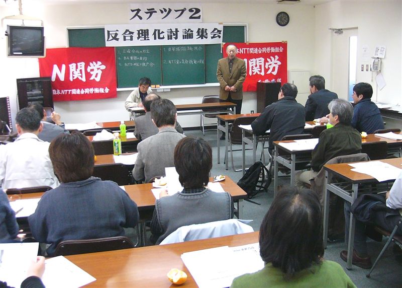 | 07/2/10 N関労東・07春闘学習討論会 N関労東は、料金業務の委託会社化や、宅内業務を委託会社へ移行拡大が提案されるなど、NTT職場に非正規労働者が拡大の一途。非正規労働者の実態を把握し、交流し、ともに人らしく働き続けられる職場を作ろう。そうした立場から、兵庫・武庫川ユニオンの小西書記長をお迎えし、「07春闘の情勢と、未組織労働者の実態・闘い」をテーマに講演していただく。 多くのNTT関連で働く正規・非正規労働者の参加をお願いします。 |
